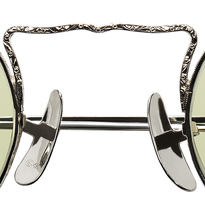 このフロントとテンプルで異なるパターンの彫金模様が採用されるのもGIGLAMPS所有の別のMH HARRIS製の14K金無垢の2ポイントリムレスでこれと同様の事象が確認できており、
