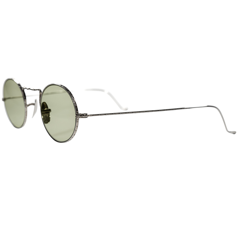 セミオーバル型、フロントとテンプルの異なる彫金模様、丸眼鏡として極上のサイズ感、