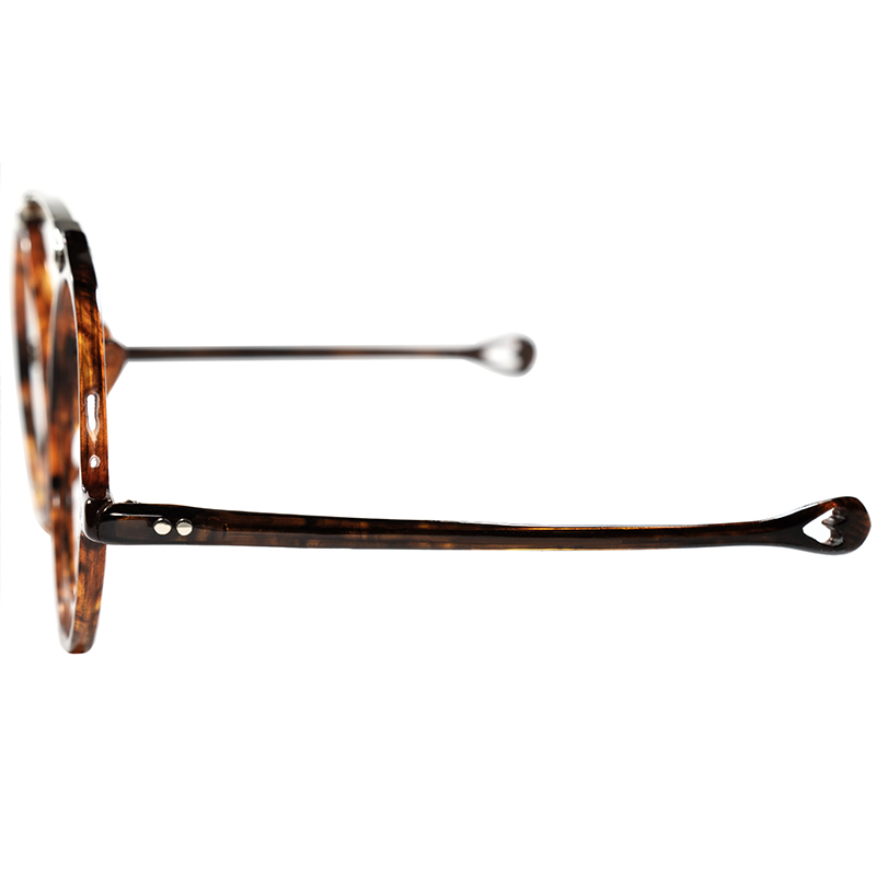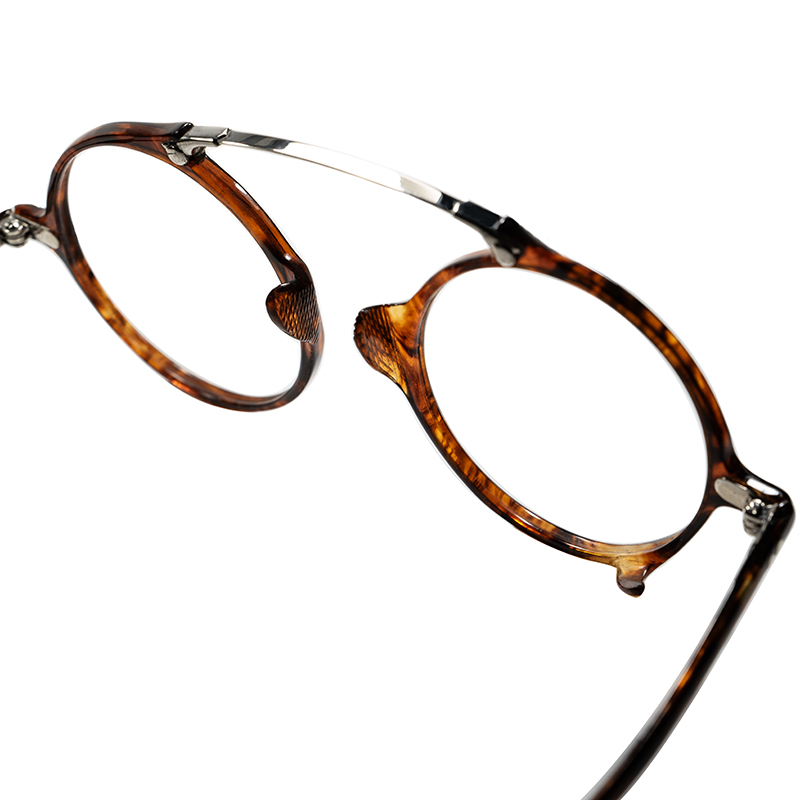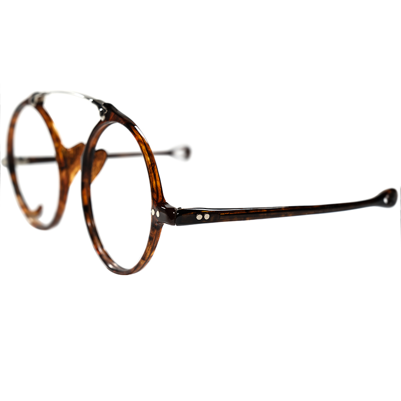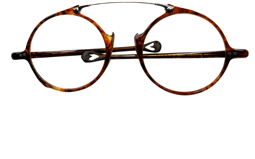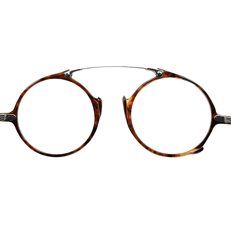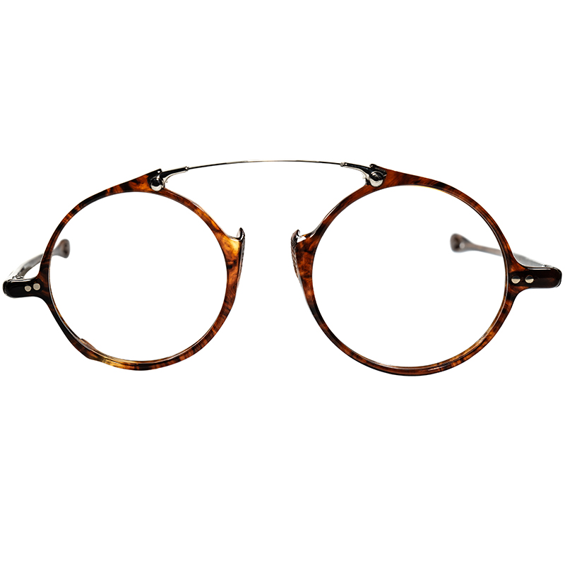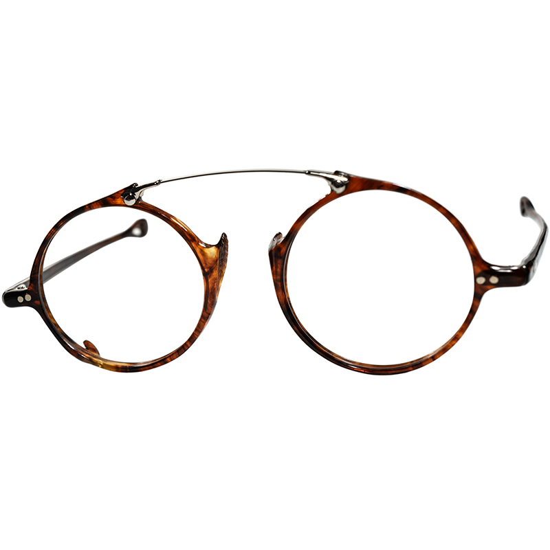 当時の鼻眼鏡でも異例ともいえるマテリアル使いを体現しており、セルロイド生地の中に一部鎮座する14Kホワイトゴールド金無垢の生っぽい質感がより一層際立っており、