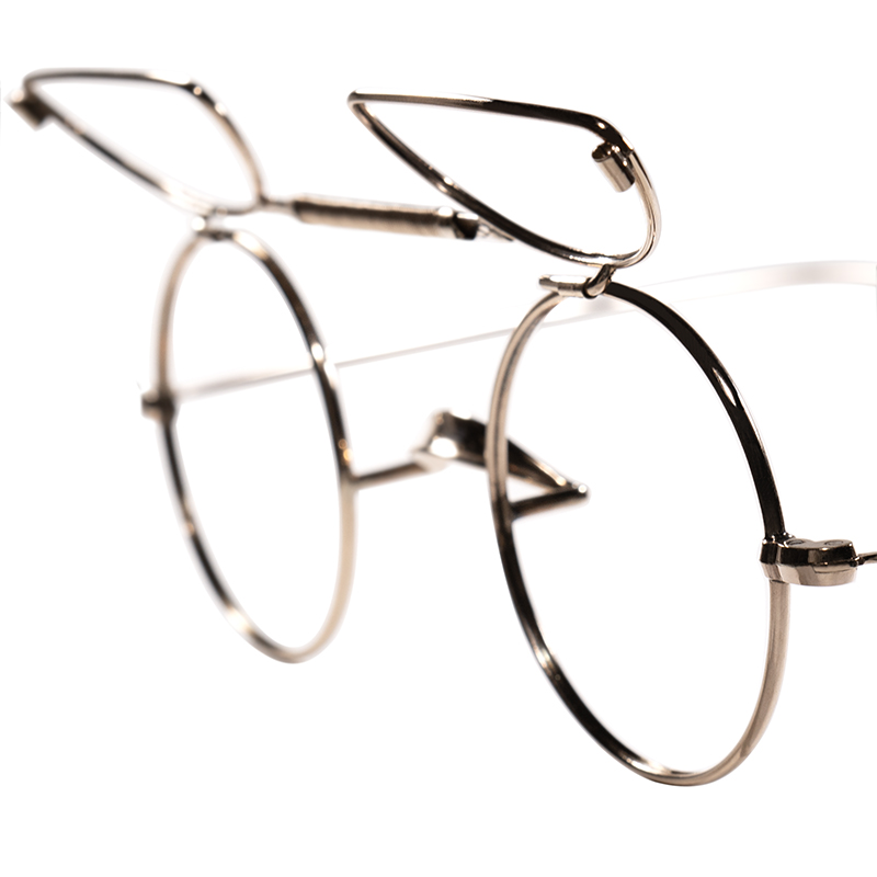CLASSICな一山式ブリッジのまん丸なラウンドをベースに、ラウンドの上部を覆う半月型の跳ね上げのレンズ枠、そして可動式のスプリングコイルがあしらわれた跳ね上げ部分のブリッジ
