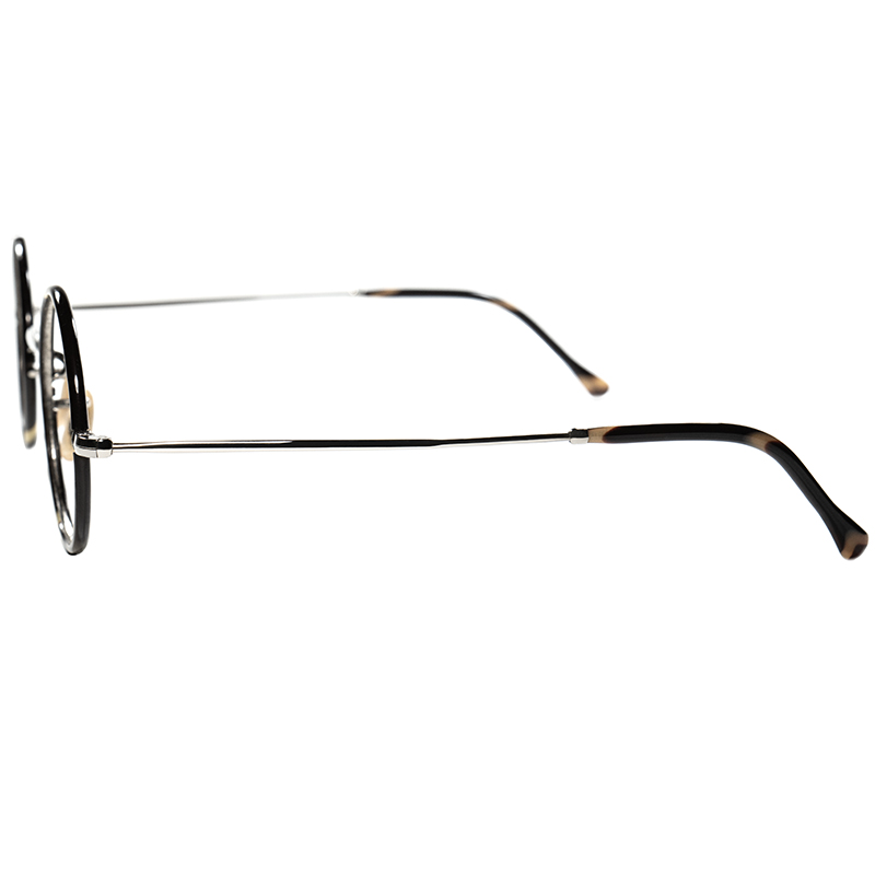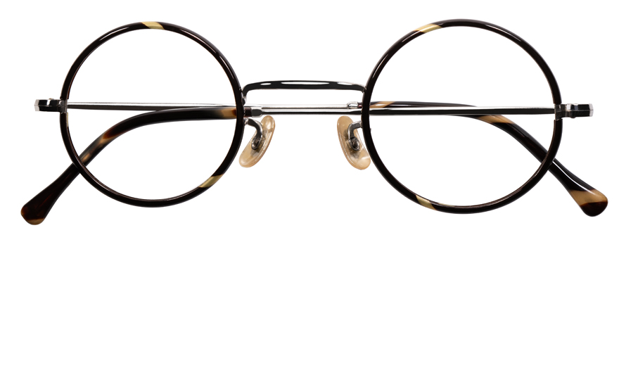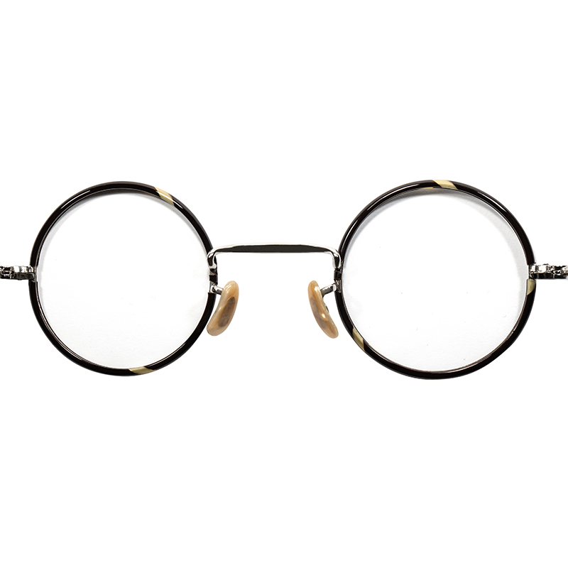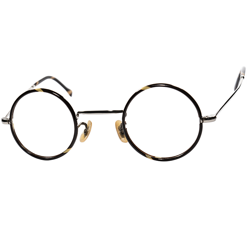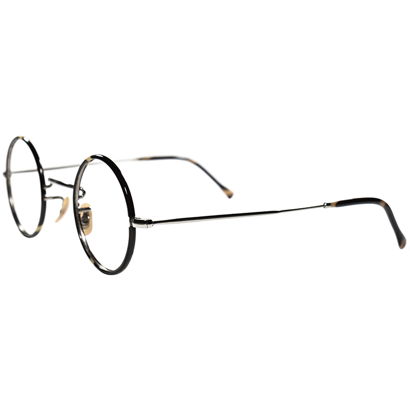 セルロイド生地をレンズ枠と先セル部分に使用し、フレームボディは鈍い輝きがアンティークな質感漂う当時ならではのシルバーメタル生地と
