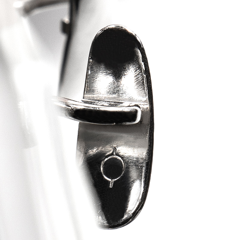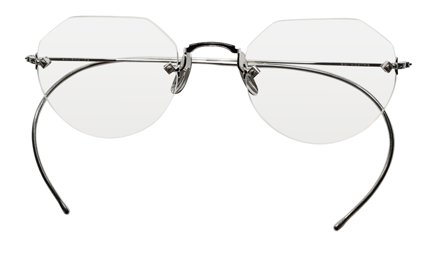 幾何学的ね形状のブリッジには端のみに手彫りのマイクロドットの彫金があしらわれるだけのシンプルな出立に、