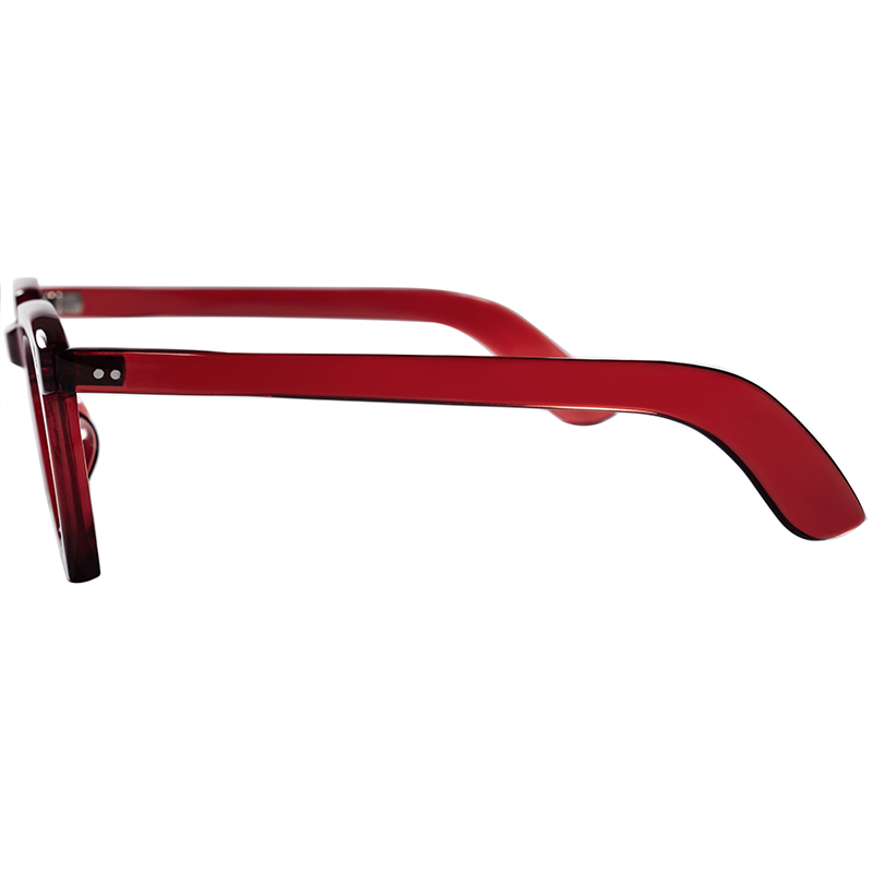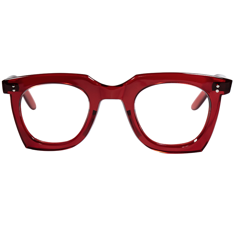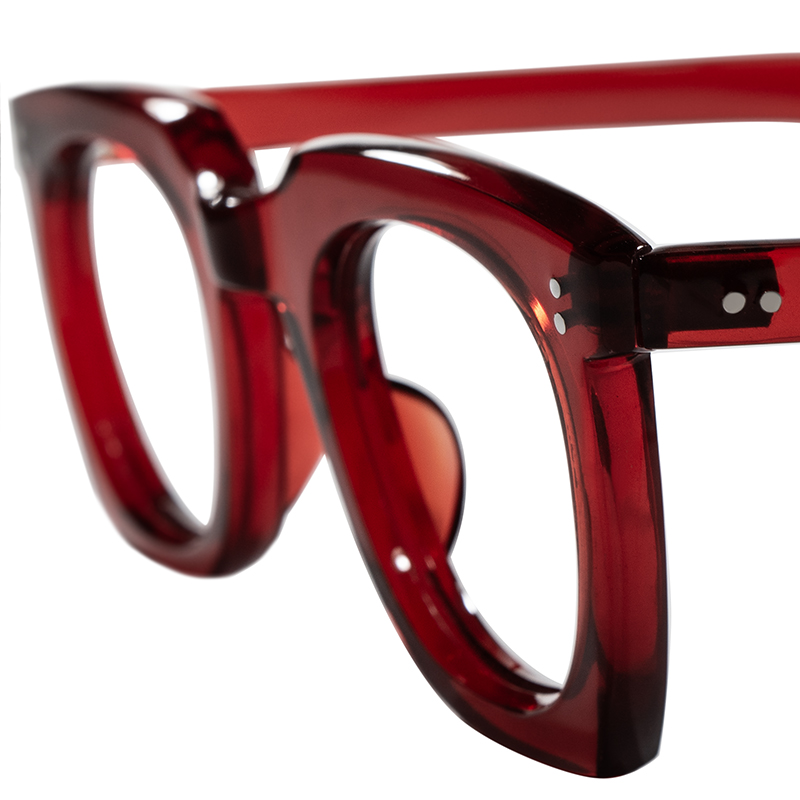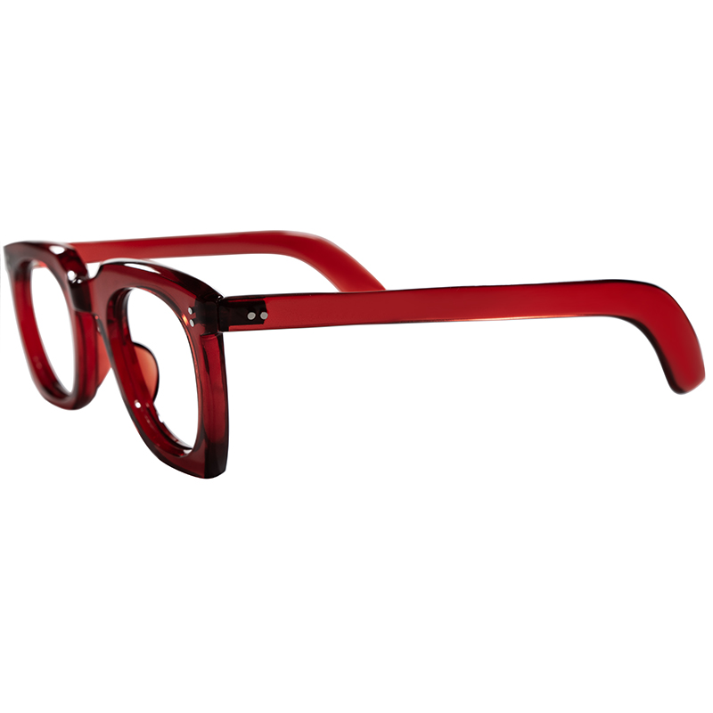 当時の芯なし系のフレームでも滅多に見ない非常に珍しいルビーのようなエレガントな赤トーンのセルロイドと推測される美しい硬質高密度な生地を使用した