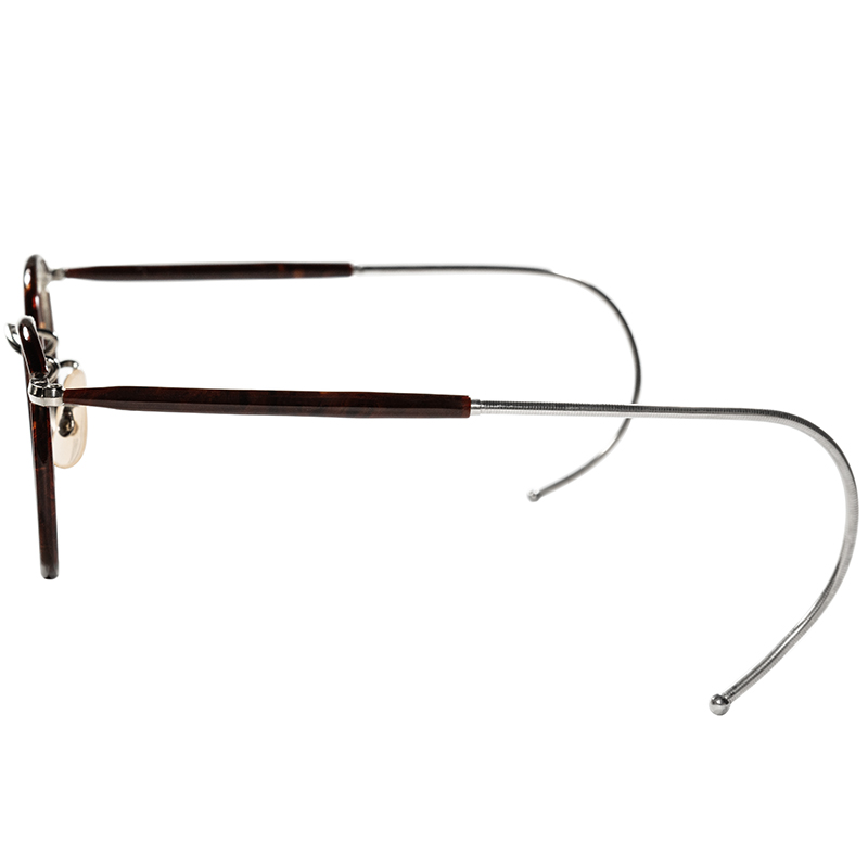 古い時代の時代ならではの質感や模様、色味、幅感のレンズ枠周りとテンプル根本に採用されたALGHAでは最も基本のカラーであり、