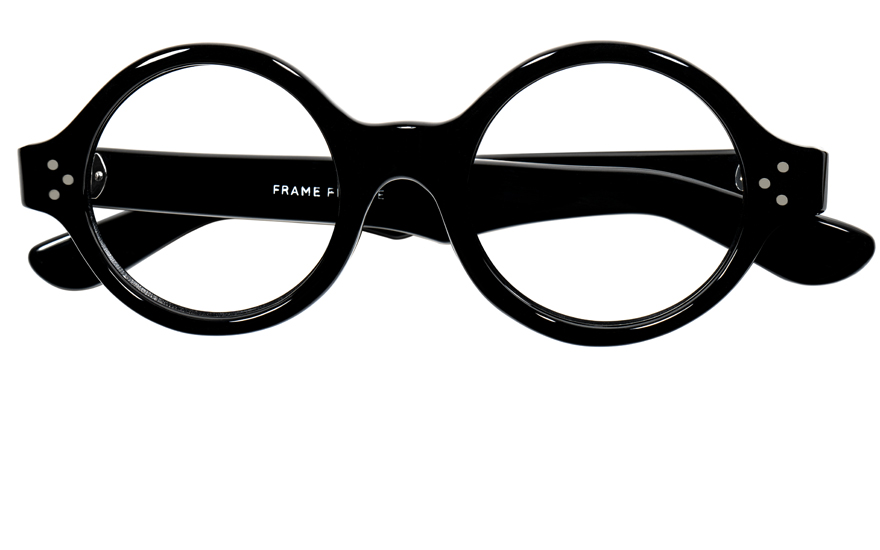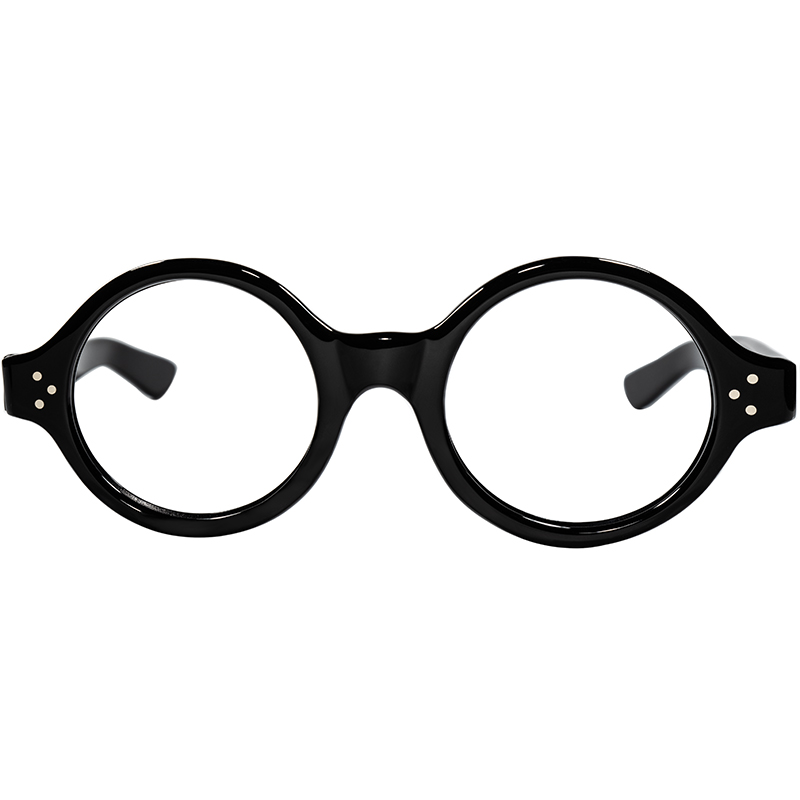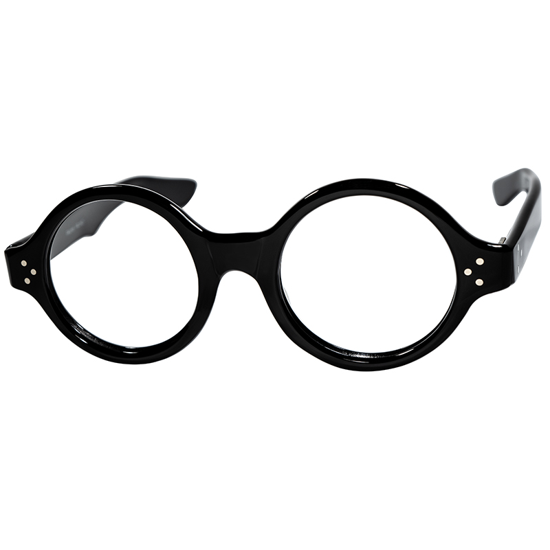 Mid Century期のこの時代に芸術家や建築家、作家などの文化人らが自身のアイコンとして、こぞって愛用したミディアムサイズほどのシルエットのまん丸のBLACKのラウンド型フレーム、