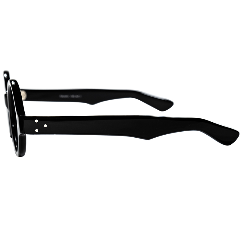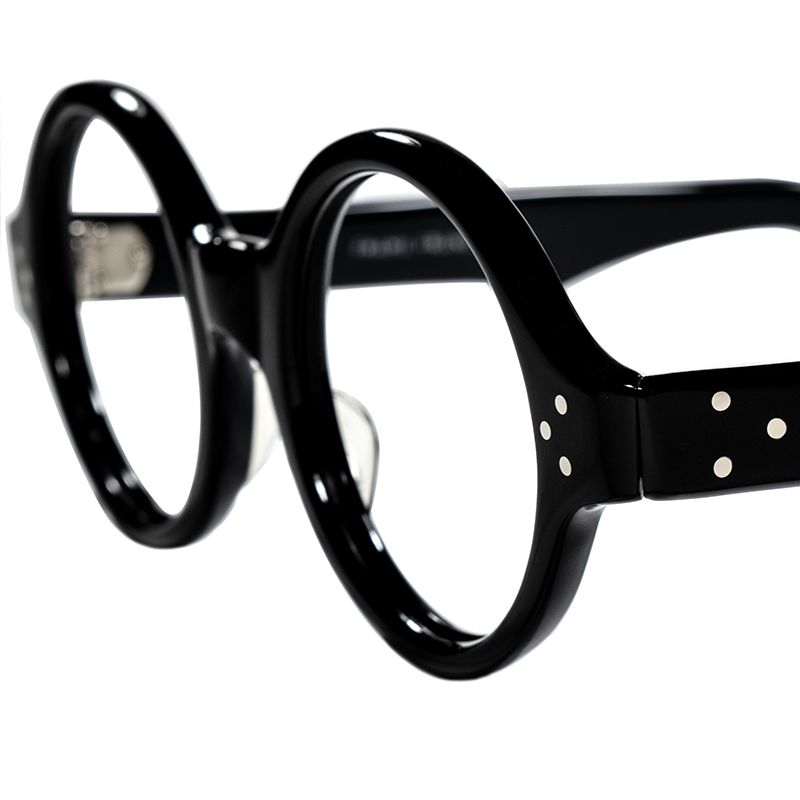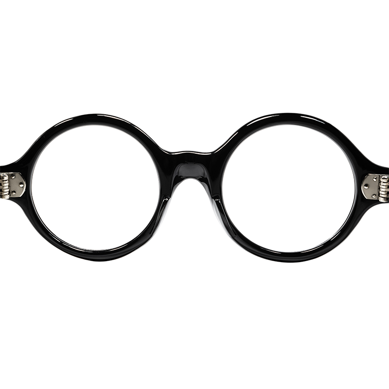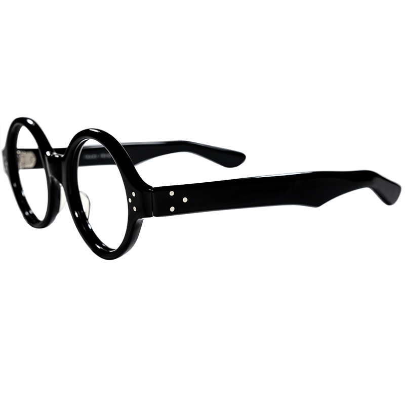 古い時代の欧米のアイウェアシーンにおいて上級なフレームである証であり、その象徴の一つともいえる3DOTヒンジがBLACKのまん丸フロント、テンプルの両方に鎮座する